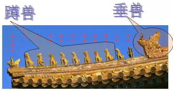 垂(斜)脊的外端(檐角一端)排列著一系列脊飾,最外面是若干個小動物稱為蹲獸,最后面龍頭狀的,稱為垂獸。